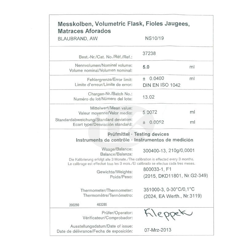 Volumetric Flask, Class A, BLAUBRAND¢ç / ¸Þ½º ¿ë·® Çöó½ºÅ©, Batch º¸Áõ¼ Æ÷ÇÔ